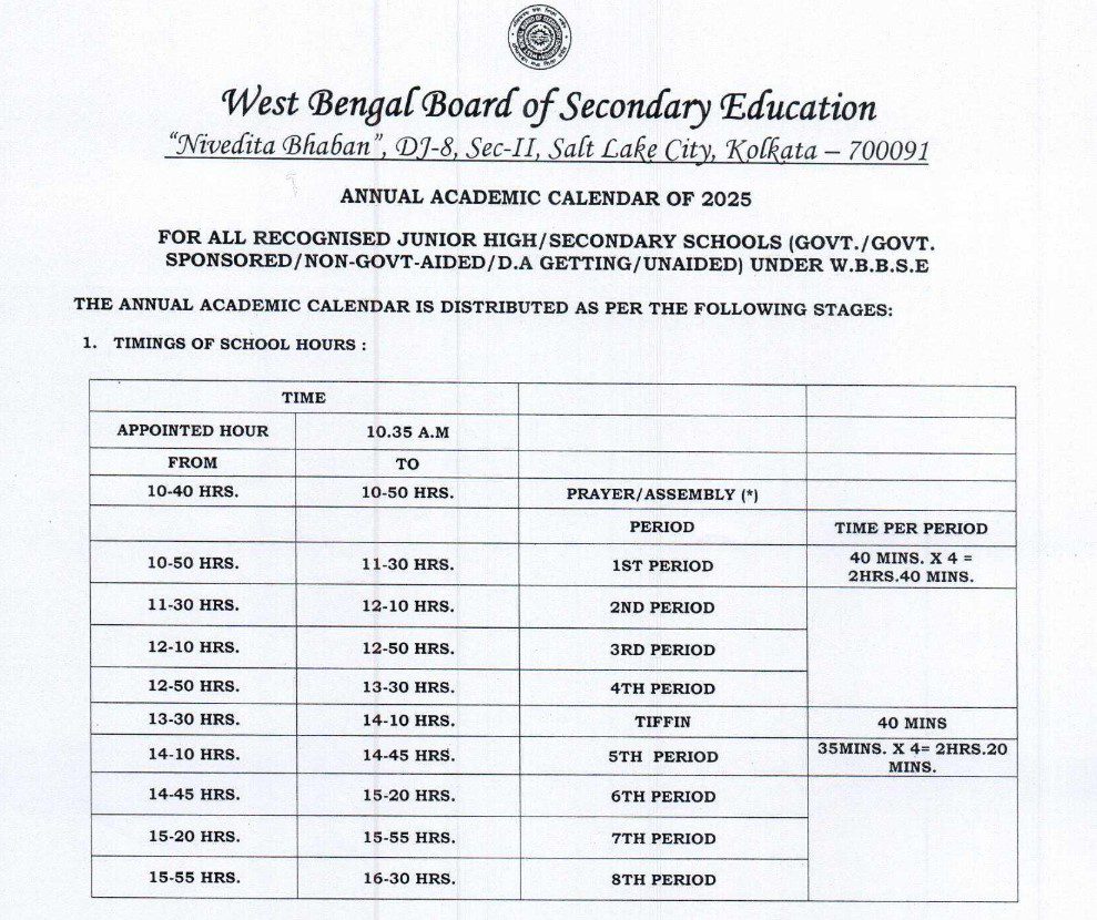 The Annual Academic Calendar of WBBSE (West Bengal Board of Secondary Education) provides a complete schedule of the academic year, including school reopening dates, examination timelines, holidays, and important events. It helps students, teachers, and parents plan their studies and activities effectively. The calendar outlines key dates for internal assessments, board exams, and co-curricular programs, ensuring smooth academic management throughout the session. Designed to maintain uniformity across all WBBSE-affiliated schools, the academic calendar promotes timely syllabus completion and structured learning. Stay updated with the latest WBBSE academic calendar to ensure better preparation and efficient educational planning